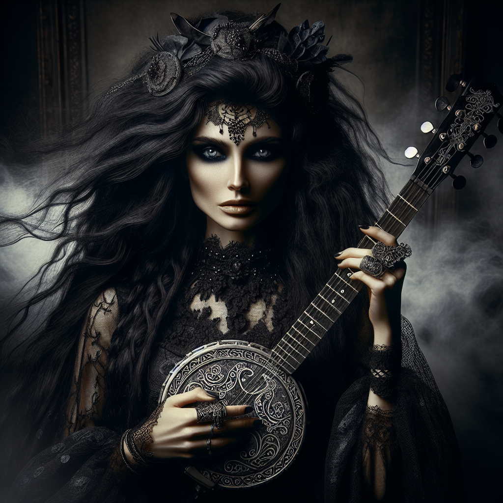 Maeve Hollowstring is a phantom-fingered banjo virtuoso who traded her soul at a Mississippi crossroads for unholy mastery of her instrument. She exists in a world where Appalachian darkness collides with gothic rock thunder—a long-haired warrior draped in black lace and leather, conjuring spirits through five strings and fury. Her music feels like graveyard dirt, moonshine sacraments, and the devil's own lullaby sung through a storm of distortion and banjo fury.