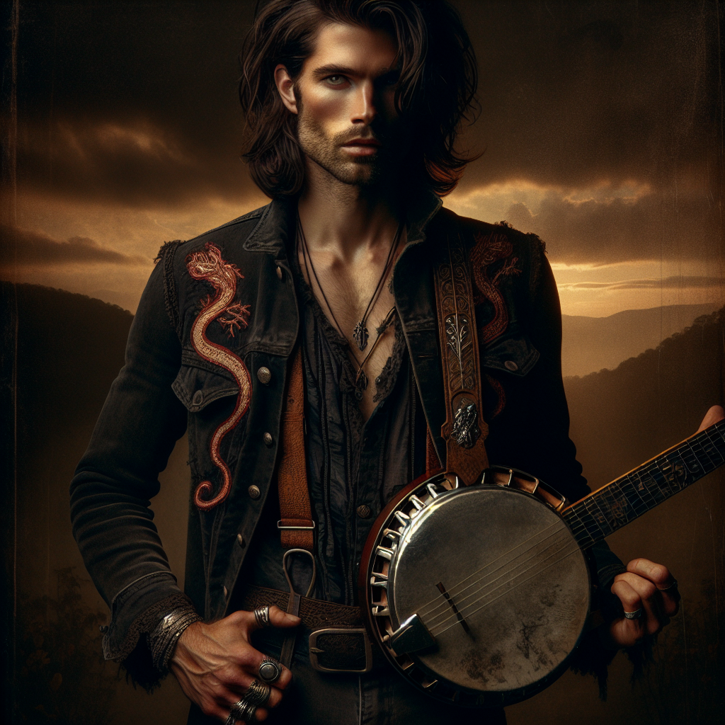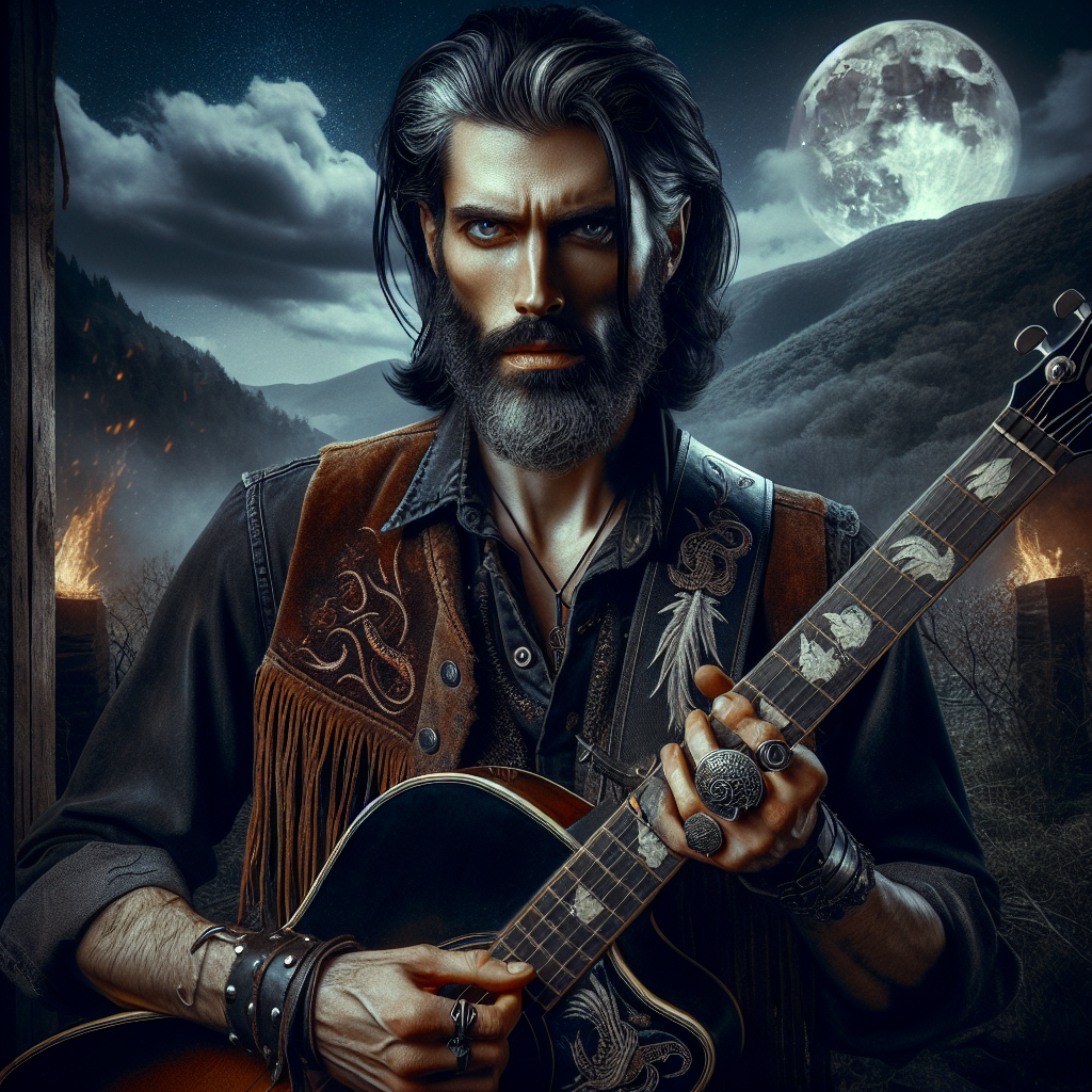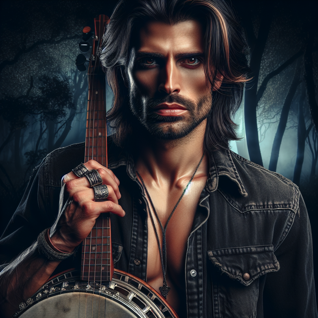 Silas Blackthorne is the mountain devil's favorite son—a backwoods legend who vanished into Appalachian hollers chasing perfection and returned with fingers too fast for mortal bones. His banjo is a relic of obsession: smoke-scarred walnut, silver-inlaid with serpent patterns, strings that hum like whispered bargains. When he plays, the air itself bends—part virtuoso, part curse, all fire and folklore wrapped in black denim and wicked charm.