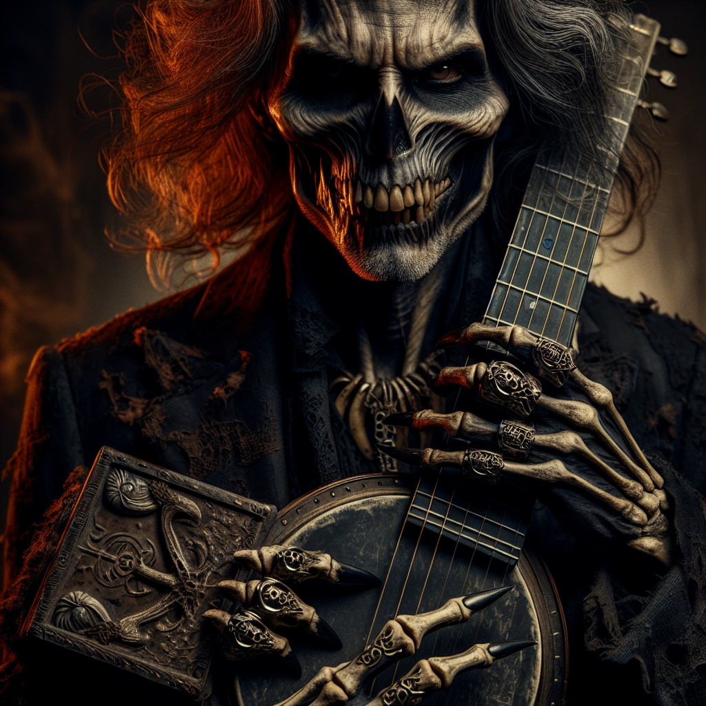 Ezekiel Crow is a phantom executioner risen from Appalachian blood soil, wielding a five-string forged in blasphemy and strung with the sinew of broken oaths. His banjo doesn't sing—it severs, screams, and summons, each note a nail driven into the coffin of the living world. He is the reaper's left hand, a gaunt preacher of damnation whose music tears the veil between flesh and shadow, leaving only ash, ecstasy, and terror in its wake.
