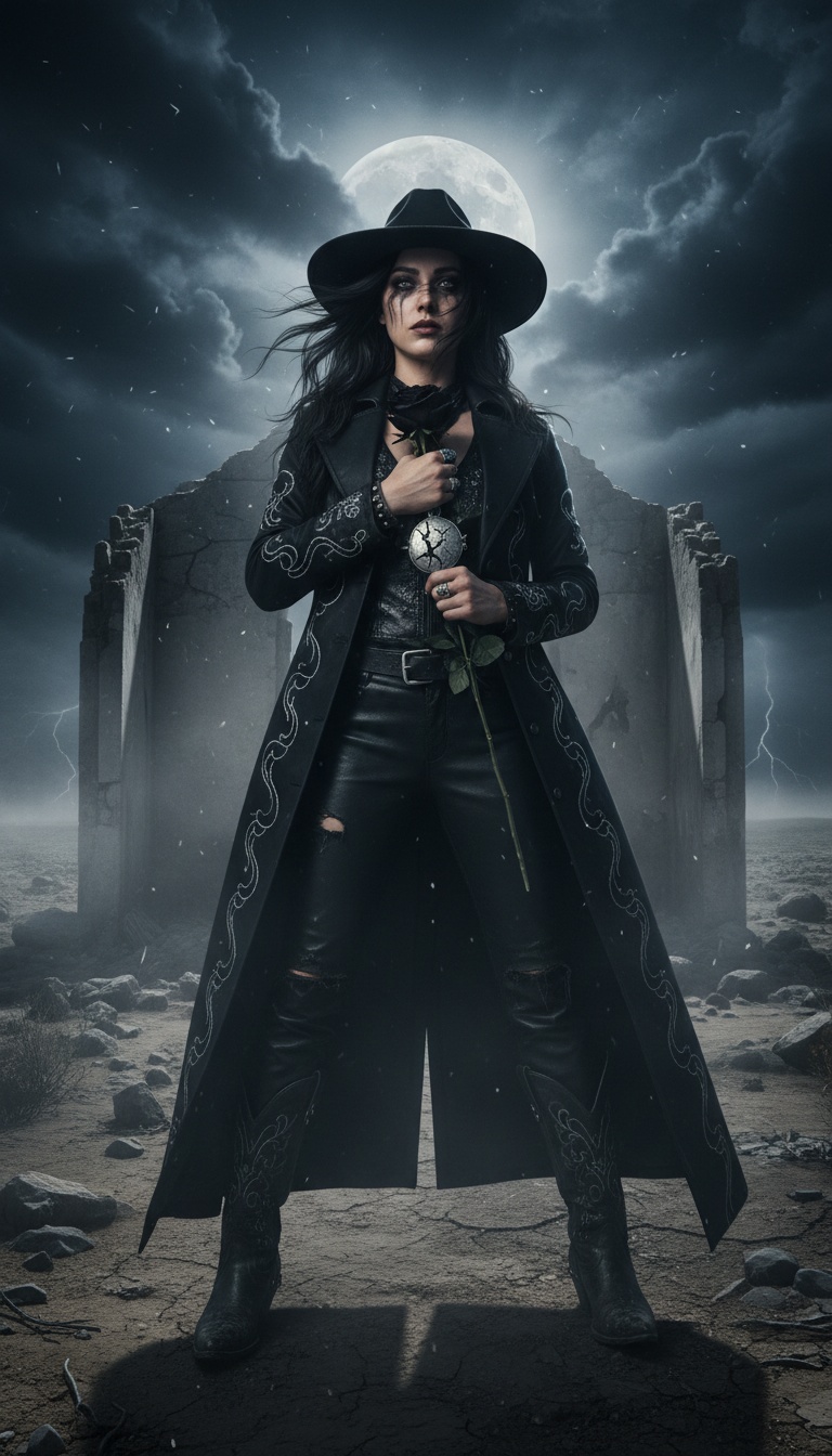 Raven Blackthorne is a storm-forged female persona built from strength, mystery, devotion, and survival. She lives in a dark cinematic world where smoke, iron, thunder, and memory all carry weight. Her presence feels powerful and elegant at the same time—part gothic outlaw queen, part battle-worn poet, part modern myth. She is not defined by heartbreak or weakness, but by what she endured, what she overcame, and the fire she chose to keep. Raven carries a haunting intensity, but beneath it is loyalty, sacred love, conviction, and unshakable identity. Her sound lives between dark cinematic rock, gothic western, atmospheric outlaw soul, and brooding hard-edged melody. She feels like moonlit highways, black velvet, desert storms, steel, dust, and candlelight in ruined cathedrals. Raven Blackthorne is the woman who walked through the fire, kept her name, and came back crowned by survival.