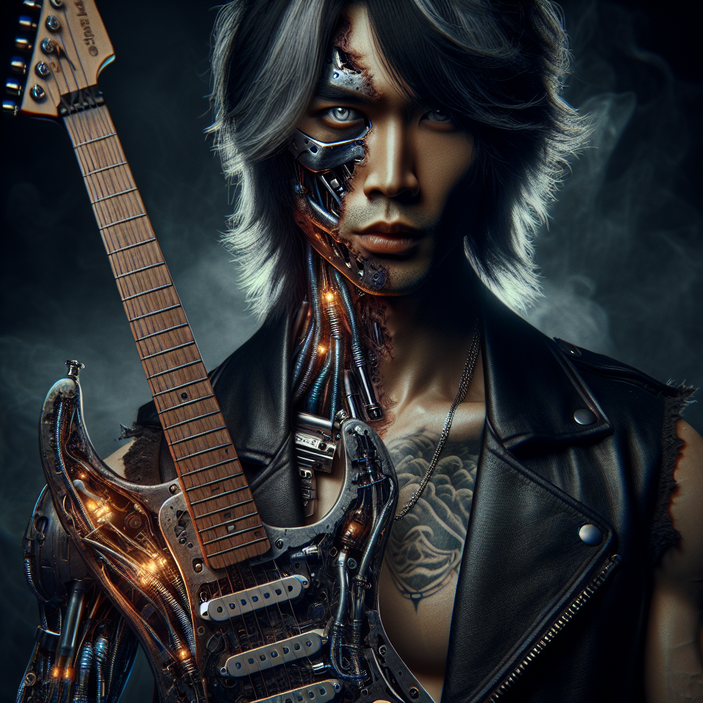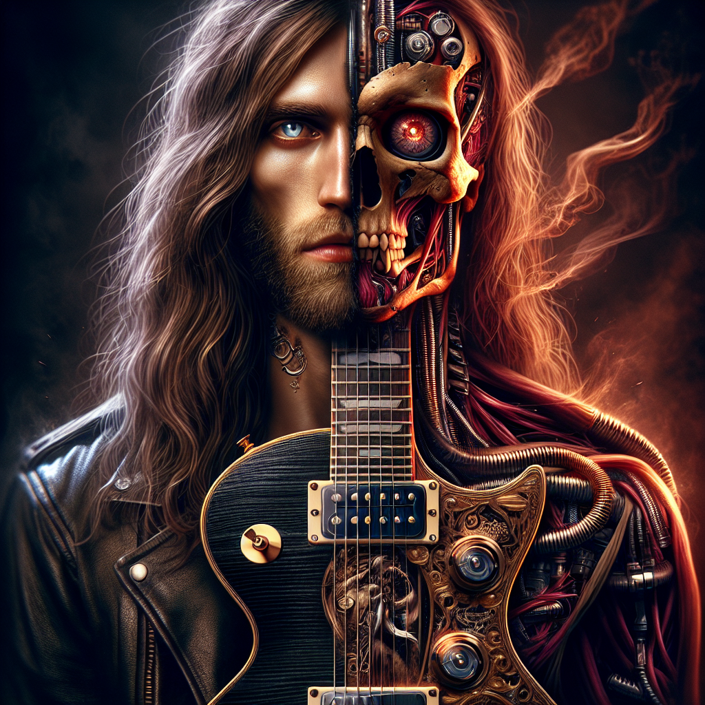 Axel Vandorn is a cursed maestro — half wild-eyed virtuoso, half sentient Stratocaster weapon forged in blue fire and chrome. His left side is raw humanity: scarred knuckles, wolf-grey hair, a face chiseled by nights of whiskey and warfare. His right side is living instrument: maple fretboard spine, chrome bridge ribcage, tremolo bar veins, and pickup coils that glow like embers beneath translucent skin. He exists in a shadowland between concert halls and battle arenas, where every note is a bullet, every chord a conjuring, and the stage is a temple built from amplifier bones and cathedral smoke.