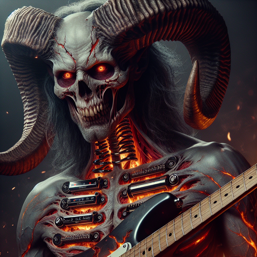 Vexthor Ironstring erupted from the coal-black forges of damnation, a guitar-possessed wraith whose flesh melted into Stratocaster chrome and bloodwood, with ram horns curling back from a scarred skull, crimson eyes blazing like brake lights in fog, jagged teeth glinting behind a predator's grin, ashen grey skin split open by glowing ember fissures, and tremolo springs coiled through his ribcage like steel intestines — pickup magnets beat where a heart should, fretboard scars carved down his forearms, tuning pegs jutting from collarbones. He commands a stage built from demolished recording studios and burning Marshall stacks dripping molten gold, where every harmonic screams like jet engines tearing apart and every bend sounds like metal twisting under impossible pressure, a vicious tempter who wields music like a serrated blade and leaves nothing but scorched earth and addiction in his wake.