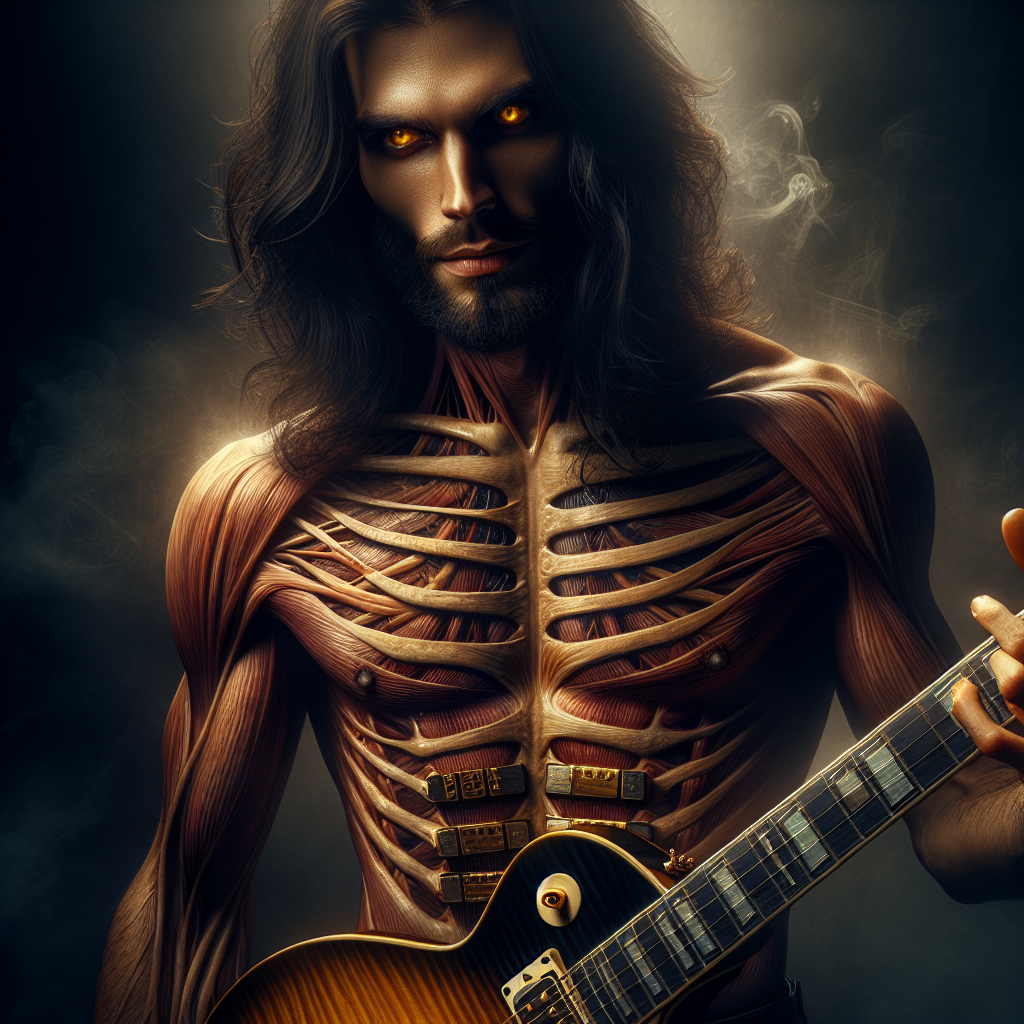 Caine Hollowridge was once the most dangerous guitarist to walk a stage — until a backroom deal in a Budapest ruin fused his flesh with a 1959 Gibson Les Paul, carving its carved maple top into his ribs, threading its strings through his sternum, embedding gold-topped humbuckers where muscle once moved freely. Now he walks the earth as a cursed rock warlord, sharp-featured and wild-haired, his eyes burning with amber hellfire, his body a living instrument of seduction and suffering, performing in cathedral basements and abandoned opera houses where the air tastes like gunpowder and aged whiskey, every note drawn from his own fused anatomy a prayer and a threat.