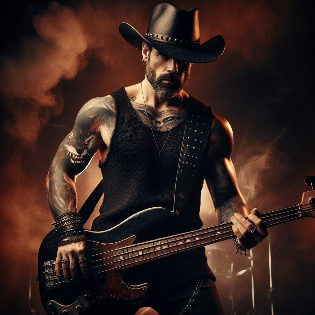 Colt Rainer is a six-string prophet of the low end — a wolf-tattooed bass player who wears his black cowboy hat like a crown of shadows and his silence like armor. Every stage he steps onto becomes his territory, every groove he lays down hits like a warning shot, his muscular arms wrapped in ink that tells stories he'll never speak aloud. The wolf on his shoulder isn't decoration — it's a declaration, a symbol of the lone predator energy he carries through smoke-filled rooms where the bass rumbles like distant thunder and danger tastes like whiskey.