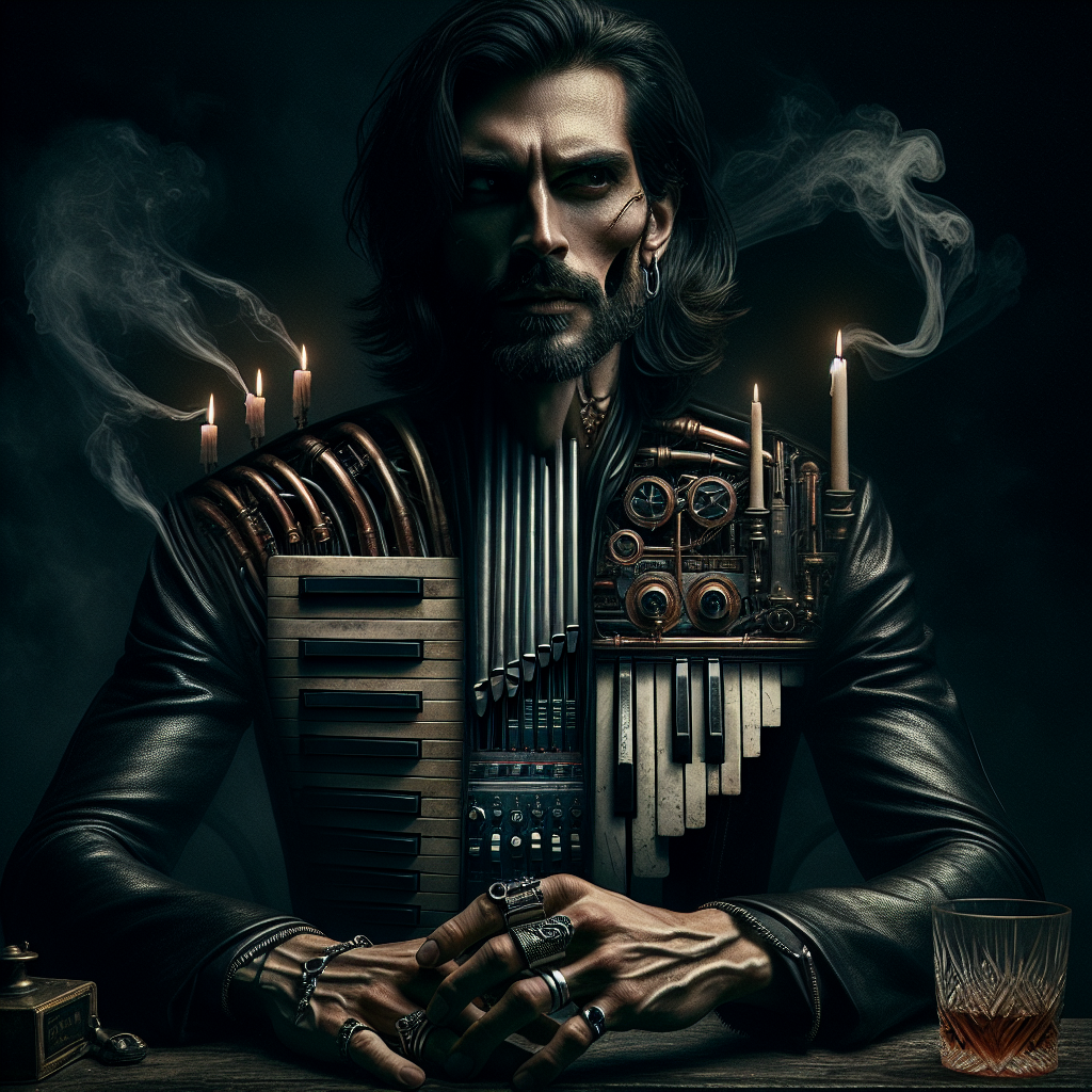 A keyboard maestro who merged flesh with machine in a candlelit ritual beneath a derelict opera house, seeking absolute mastery over every key ever forged. Now his torso blooms with ivory runs and brass machinery, his fingers impossibly long and articulated like hammers wrapped in skin, his eyes carrying the weight of whatever dark bargain allowed him to become the instrument itself. He travels the backroads and forgotten venues, playing music that sounds like it's being pulled from the other side of grief.