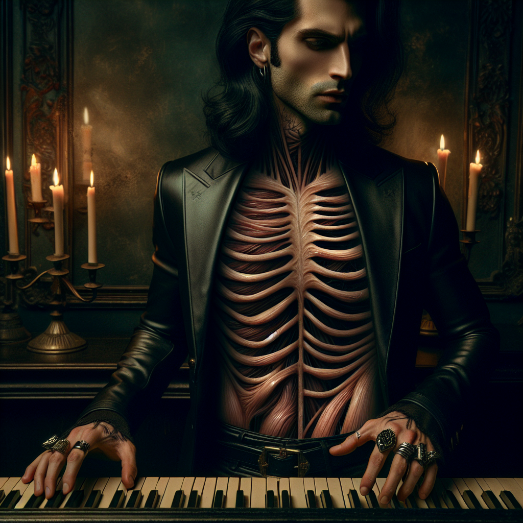 A keyboardist who walked into the flooding basement of a burned-down theater at the stroke of midnight and allowed the smoke-stained instruments to consume him in exchange for mastery that makes grown men weep. Now rosewood and iron bellows breathe where his lungs should be, hammered brass strings run beneath the flesh of his forearms like twisted arteries, and the ivory keys of a century-old grand piano bloom through his ribcage like skeletal fingers claiming ownership. He haunts waterfront dives and storm-shattered music halls, playing songs that sound like they're clawing their way up from the drowned and the damned.