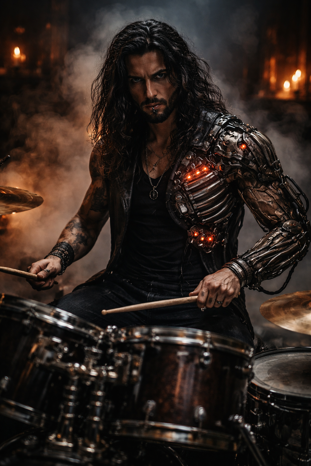 Judas Cain is a walking war machine baptized in backbeat and chrome. They say he walked into a foundry somewhere in the delta hills with nothing but sticks and hunger, and what crawled out was something else — a man whose bones now ring like struck metal, whose heartbeat syncs to kick drums that were never built by human hands. His body bears the price: drum hardware threaded through muscle and scarred flesh, cymbal bronze grafted to spine and shoulder blade, pedal mechanisms running through tendon like roots through stone. Every strike he makes carries the weight of a pact made in sparks and diesel smoke, and the rooms he plays in feel like they're holding their breath before something breaks.